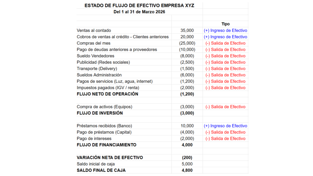 El Estado de Flujo de Efectivo registra cuánto dinero realmente entró y salió de la empresa durante el mismo periodo. A diferencia del estado de resultados, este se construye sobre movimientos reales de caja. Se divide en tres secciones: