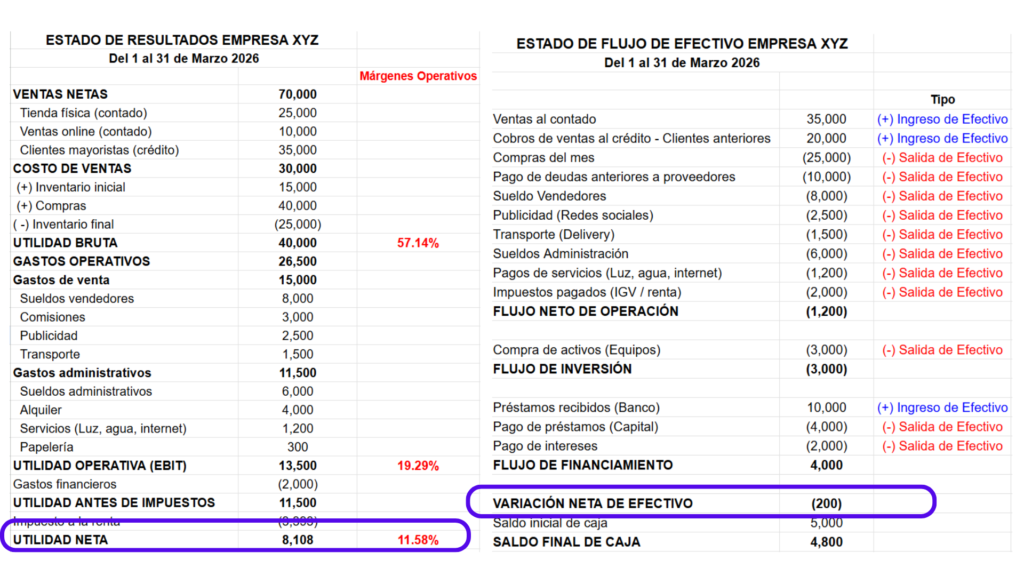 La empresa registra una utilidad de S/ 8,108 y al mismo tiempo termina el mes con S/ 200 menos en caja. Ese contraste no es un error contable: es exactamente lo que estos dos estados financieros están diseñados para mostrar.